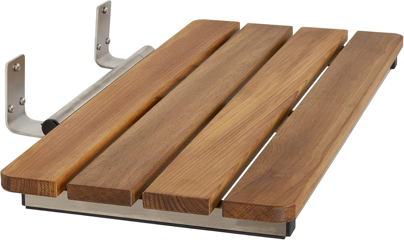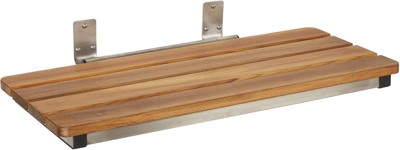 Catalina 29" x 16.5" Side Wall-Mount Folding Natural Teak Wood Tub Seat with 3" Slats and #304 Satin Stainless Steel Frame