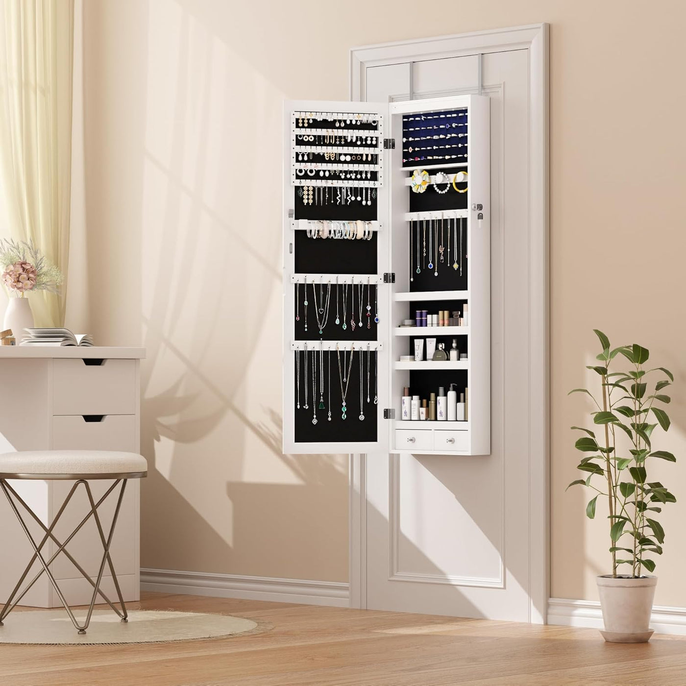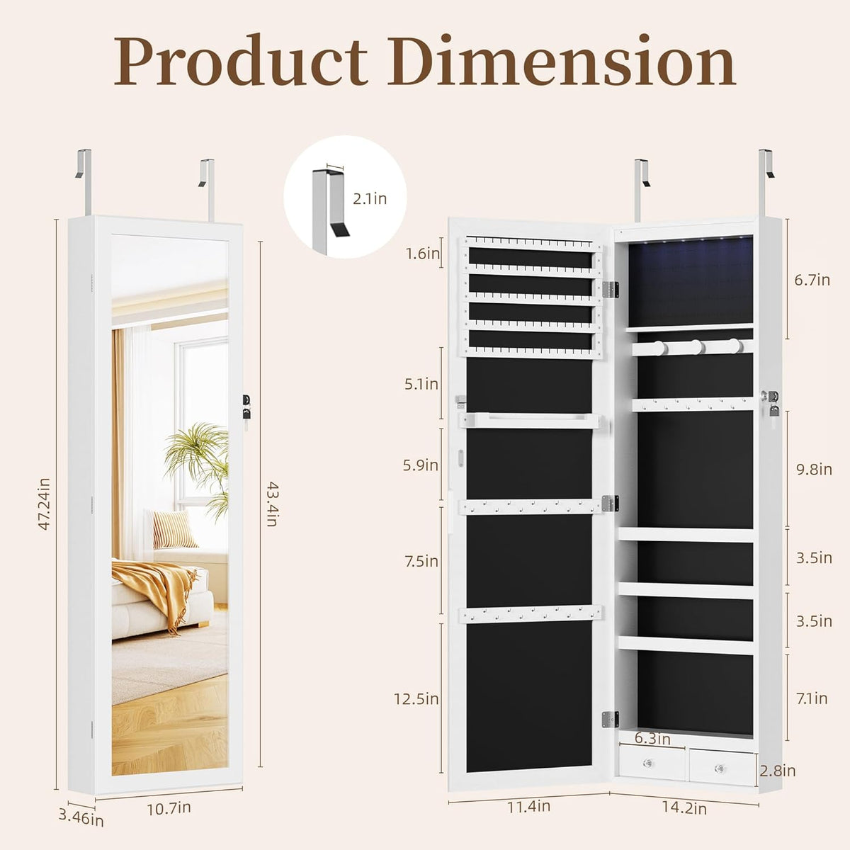 Elevon 6 LEDs Mirror Jewelry Cabinet Organizer, 47.2-inch Jewelry Armoire with Full-Length Mirror, Wall or Door Mounted Jewelry Storage, Lockable Large Capacity Storage, White