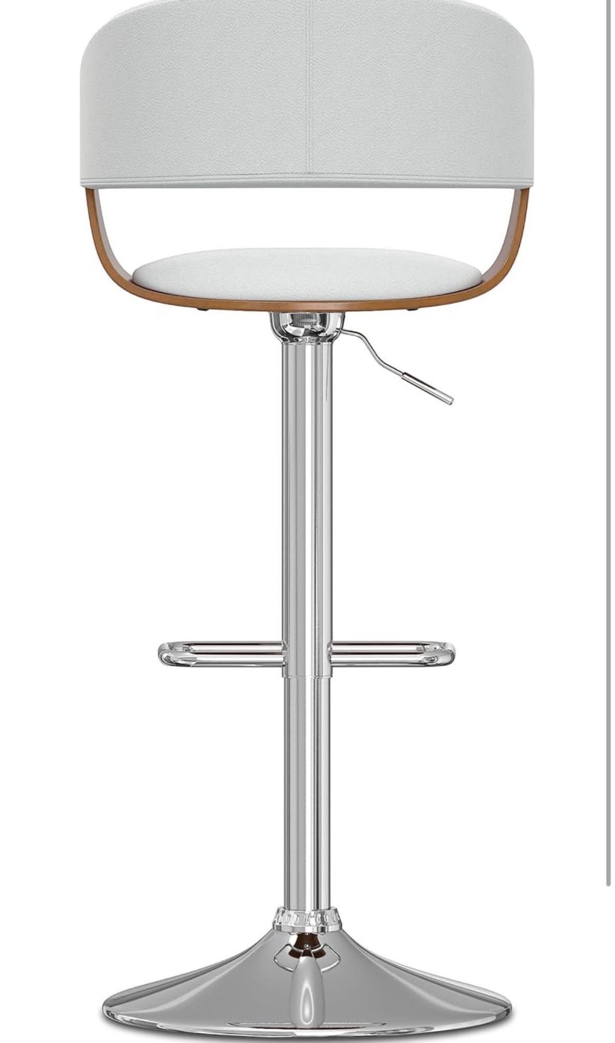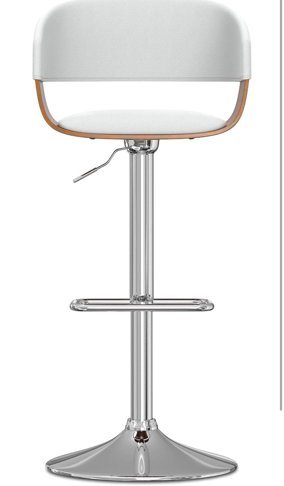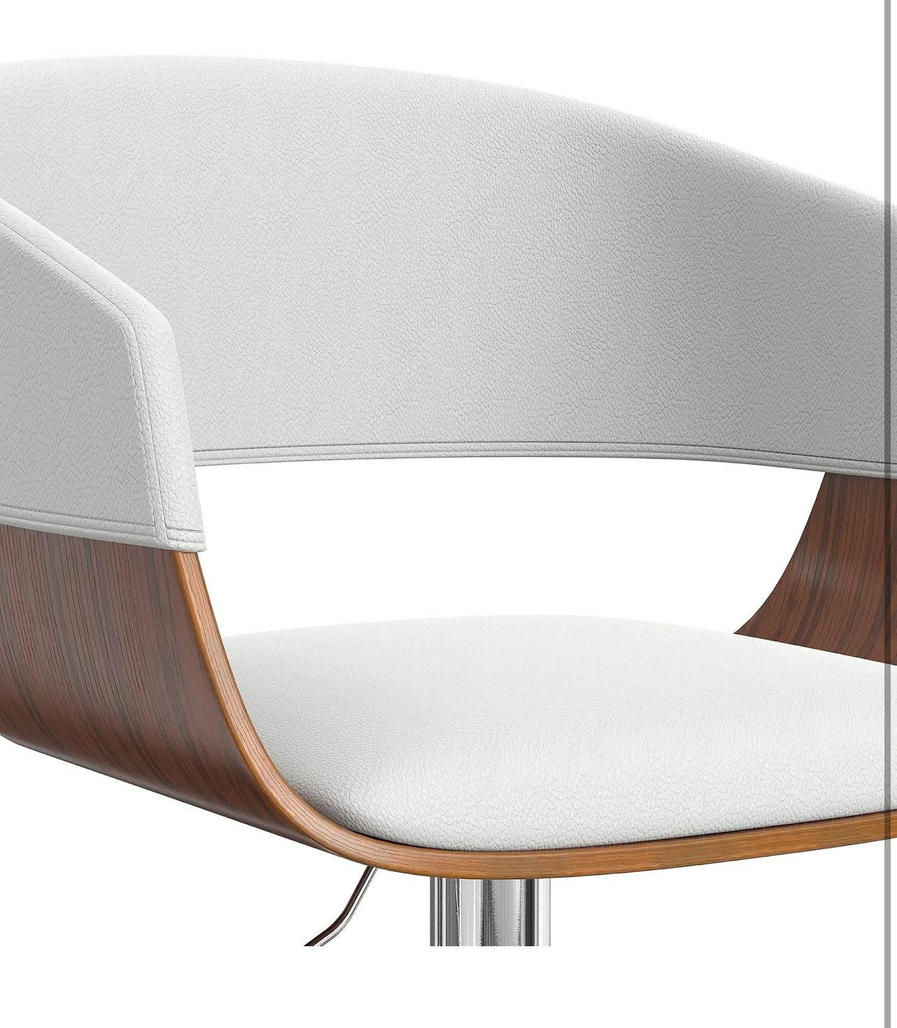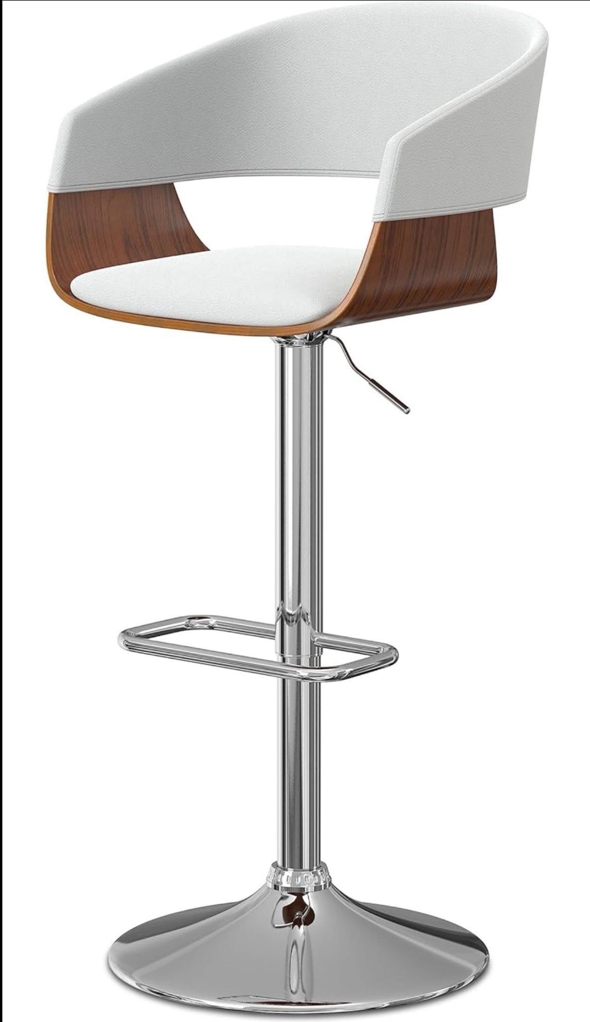 SIMPLIHOME Lowell Adjustable Swivel Bar Stool - 33 inch Seat Height Upholstered Metal Chair in White Faux Leather, Mid Century Seating for Kitchen or Bar with Curved Bentwood Back