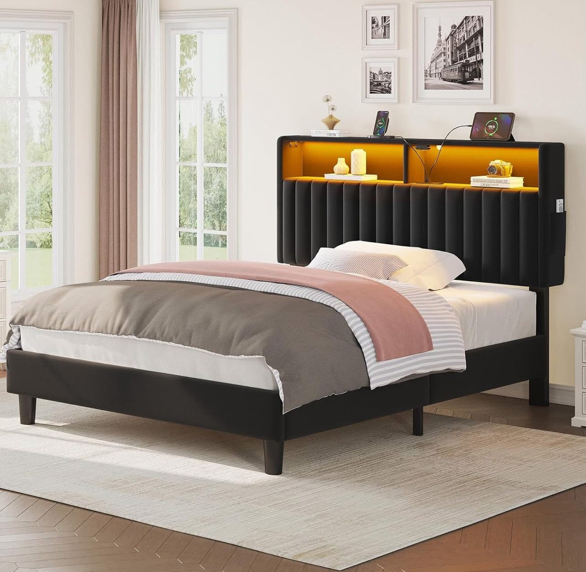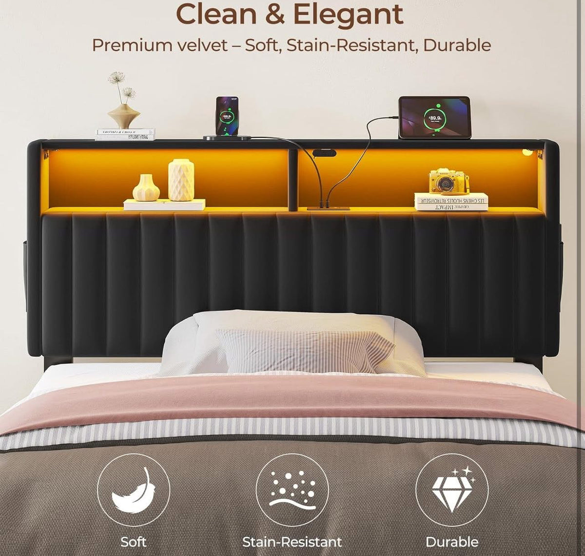 Seventable Twin Size Bed Frame with Charging Station, LED Bed with Velvet Upholstered Storage Headboard, Metal Platform with Under Bed Storage, No Box Spring Needed, Noise Free, Easy Assembly, Black